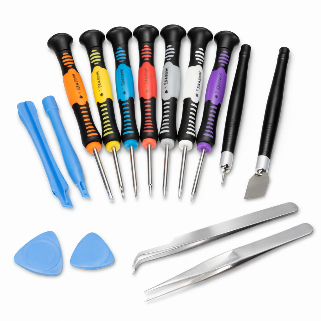 Este set incluye 19 herramientas esenciales para abrir, desmontar y reparar teléfonos y tablets de manera segura. Ideal para estudiantes, makers y proyectos escolares de electrónica, garantizando precisión y cuidado en cada intervención.