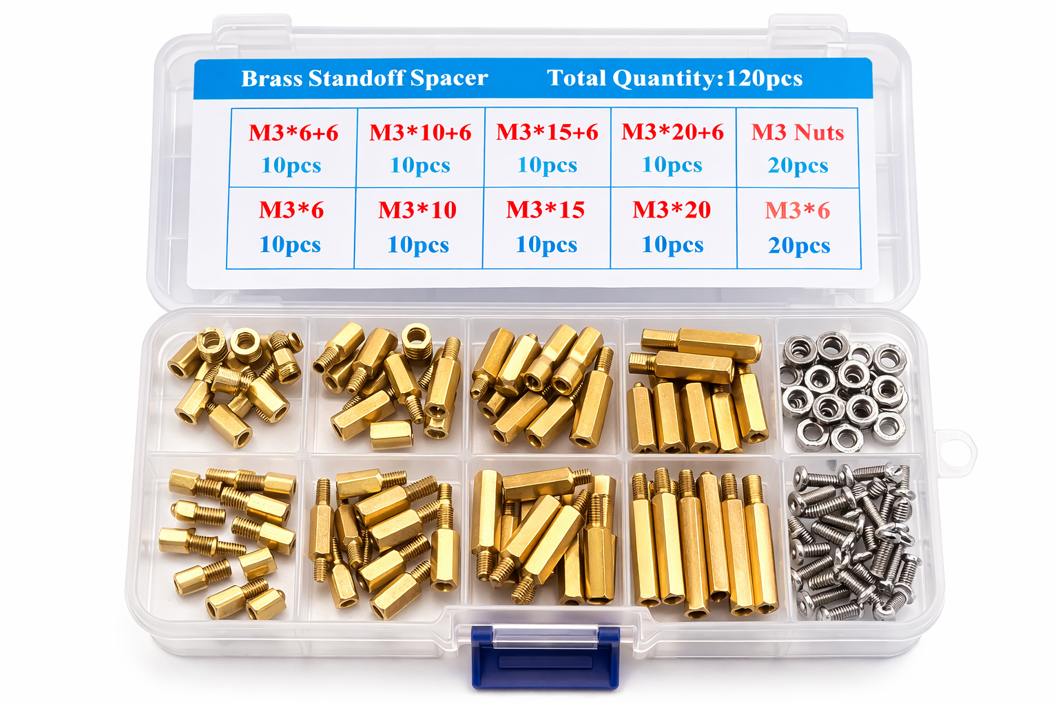 Kit de Separadores de Latón M3 incluye un total de 8 variaciones de separadores de entre 6 y 20 mm de longitud, un total de 80 separadores, 20 tornillos y 20 tuercas de acero inoxidable.