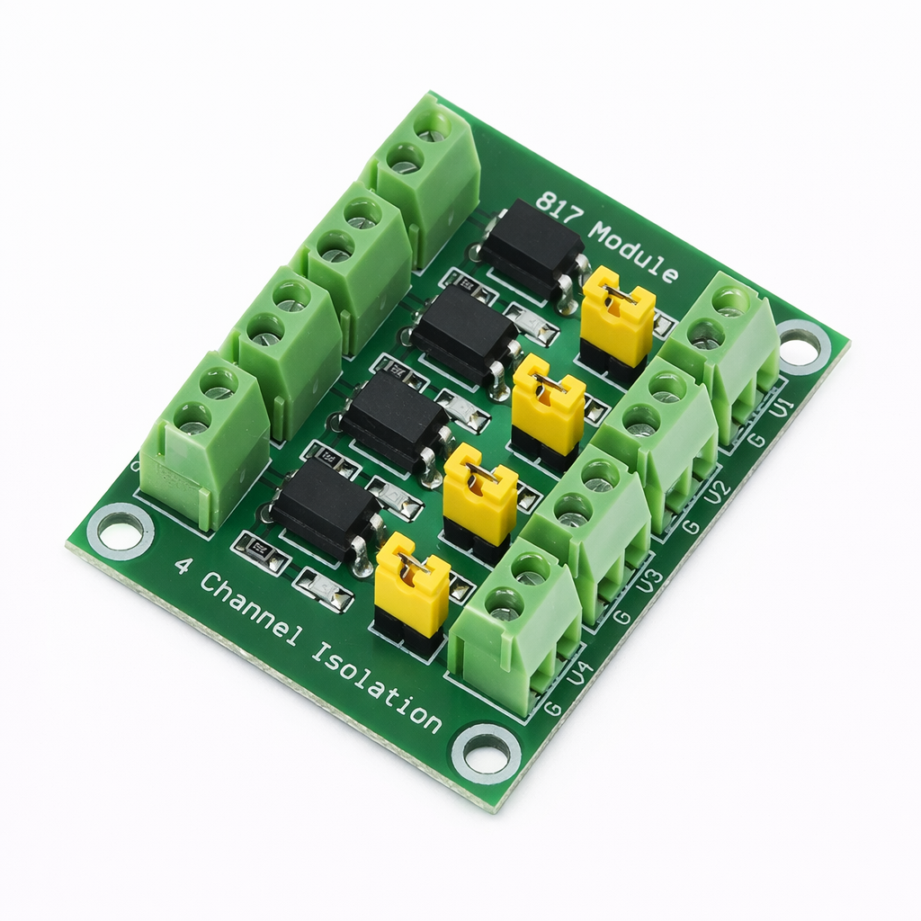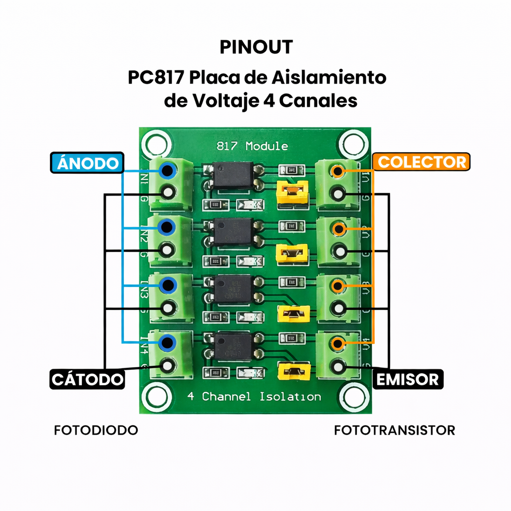Este módulo optoacoplador de 4 canales permite aislar señales digitales de un circuito a otro, protegiendo tu sistema contra interferencias y sobrecargas. Es una herramienta esencial para proyectos donde se necesita comunicación entre circuitos con diferentes niveles de voltaje.