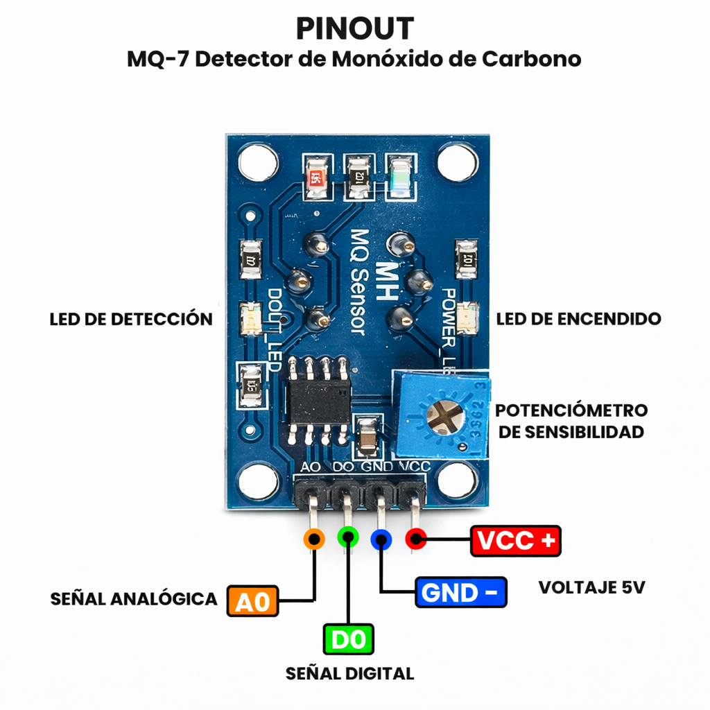 El MQ7 es un sensor confiable para detectar concentraciones de monóxido de carbono en el aire. Perfecto para proyectos educativos, prototipos de seguridad y sistemas de monitoreo ambiental, combina facilidad de uso con resultados precisos.
