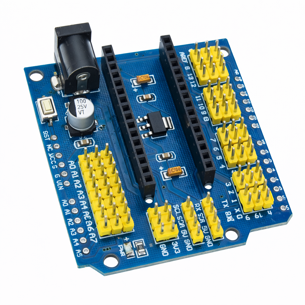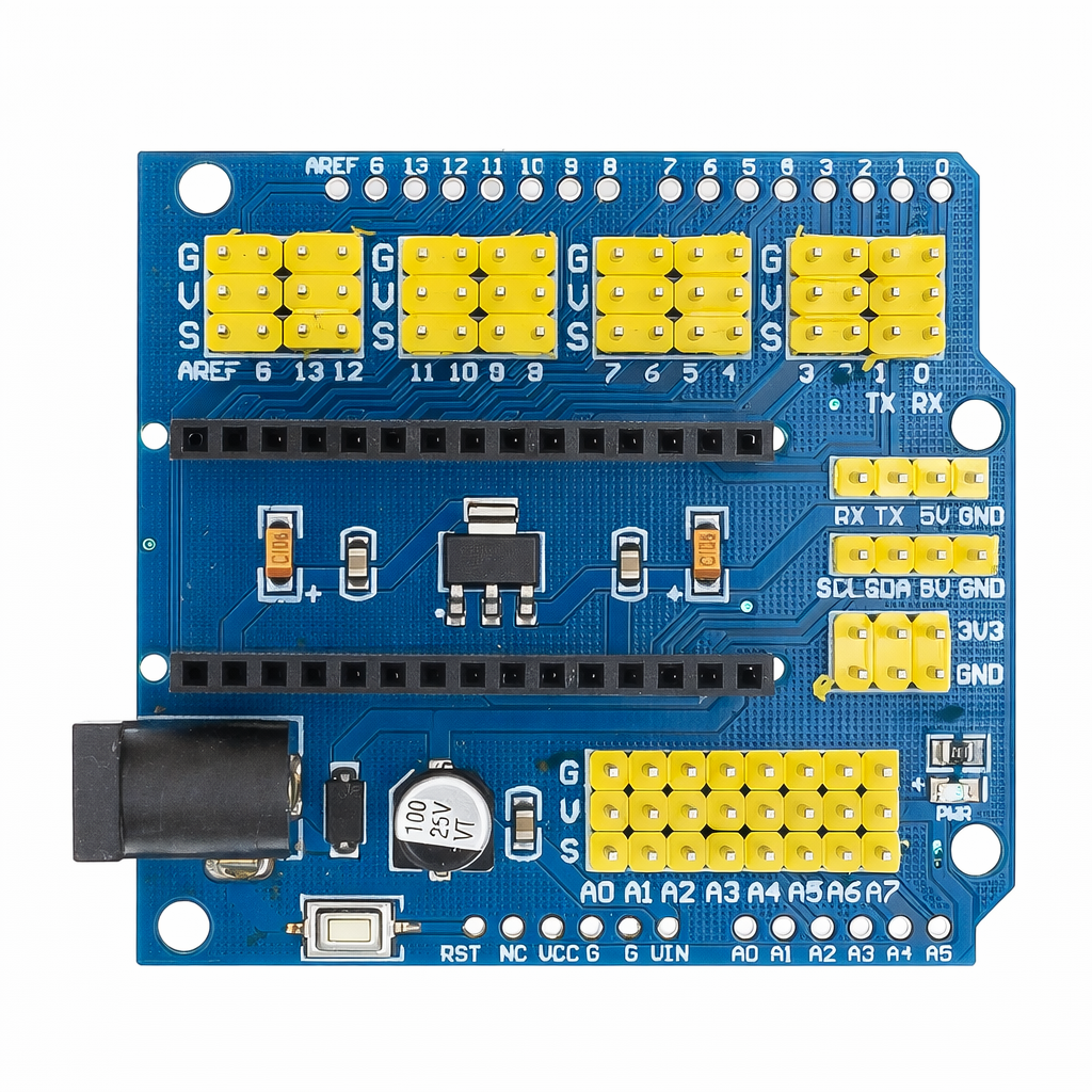 Optimiza tus proyectos de Arduino Nano con este Sensor Shield, que simplifica la conexión de sensores, actuadores y módulos. Perfecto para estudiantes, makers y desarrolladores que buscan una expansión organizada de pines para prototipos y proyectos educativos.